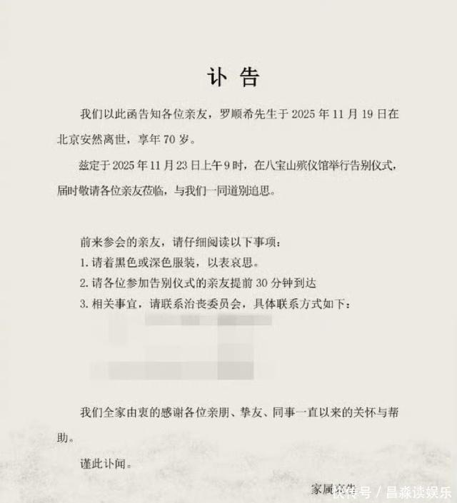 告别仪式定于2025年11月23日在北京八宝山殡仪馆莲花厅举行,起始时间为上午9点。讣告要求参加者穿深色服装,以示哀悼,并需提前30分钟到达现场。这一安排确保了仪式的有序进行。仪式当天,许多人包括网友在黎明前就赶到八宝山,排队等待进入莲花厅。现场氛围简单庄严,入口处设有对联表达对逝者的缅怀。哀悼者在秋季的寒风中排队,体现了公众对罗顺希的敬意。仪式包括遗体告别环节,家属和来宾依次进入厅内致哀。