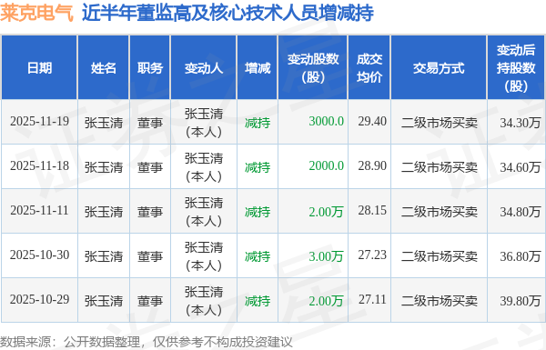 证券之星消息,根据11月20日市场公开信息、上市公司公告及交易所披露数据整理,莱克电气(603355)最新董监高及相关人员股份变动情况:2025年11月19日公司董事张玉清共减持公司股份3000.0股,占公司总股本为0.0005%。变动期间公司股价上涨0.8%,11月19日当日收盘报29.03元。